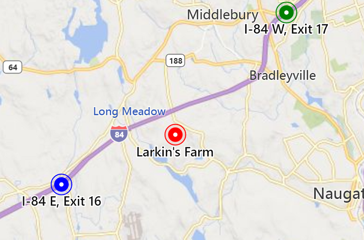 Go east on I84. Take exit 16, at end of ramp turn right onto Route 188 North. Follow Route 188 for approximately 3.2 miles. Turn right onto South Street. Larkin's Farm is 1.2 miles along South Street.